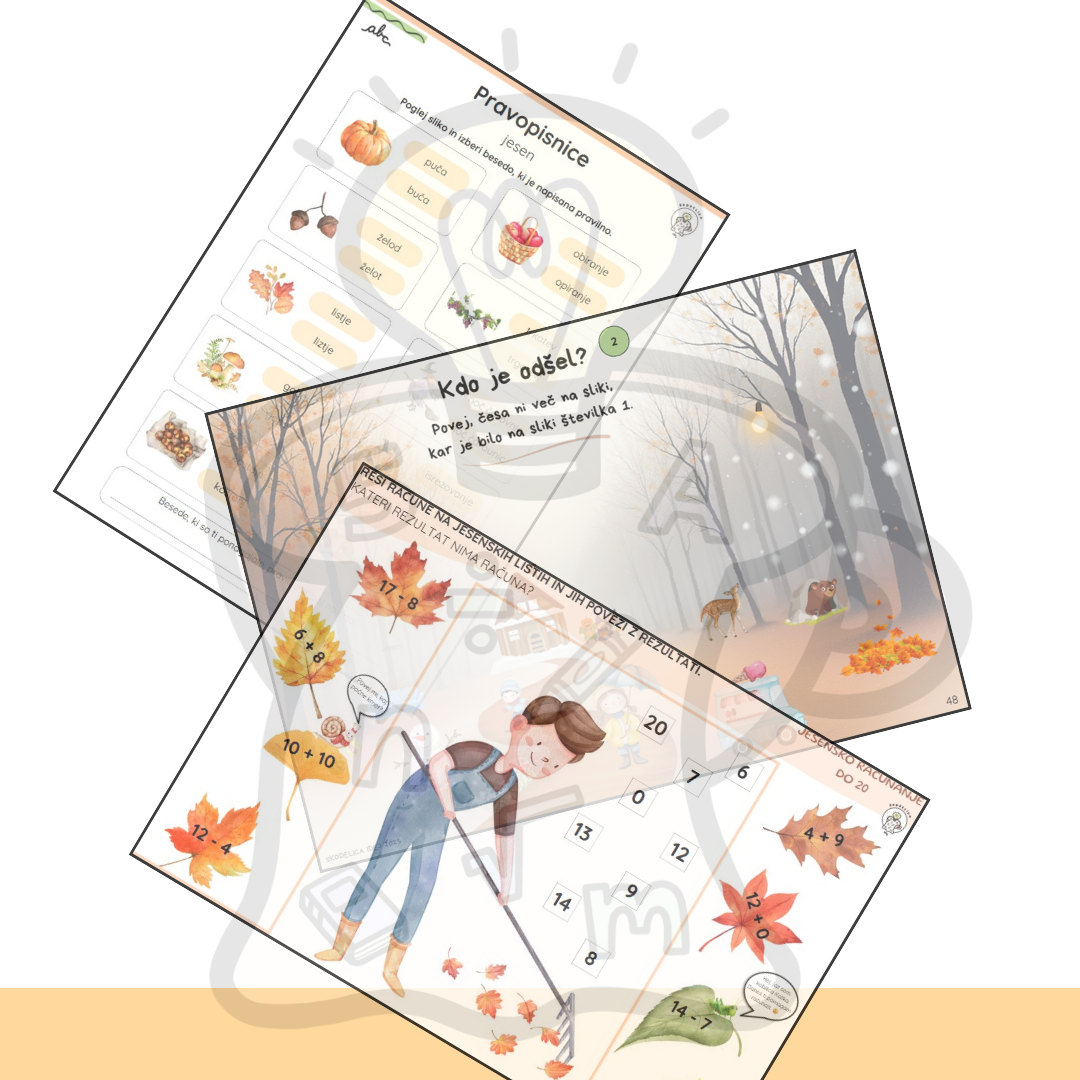 Pripravile smo širok in pester nabor učnih listov na 51 straneh, ki se navezujejo na jesensko tematiko – od računanja, besedilnih nalog, branja in pisanja, koledarčkov, iskanja razlik … Prava jesenska učna pustolovščina!