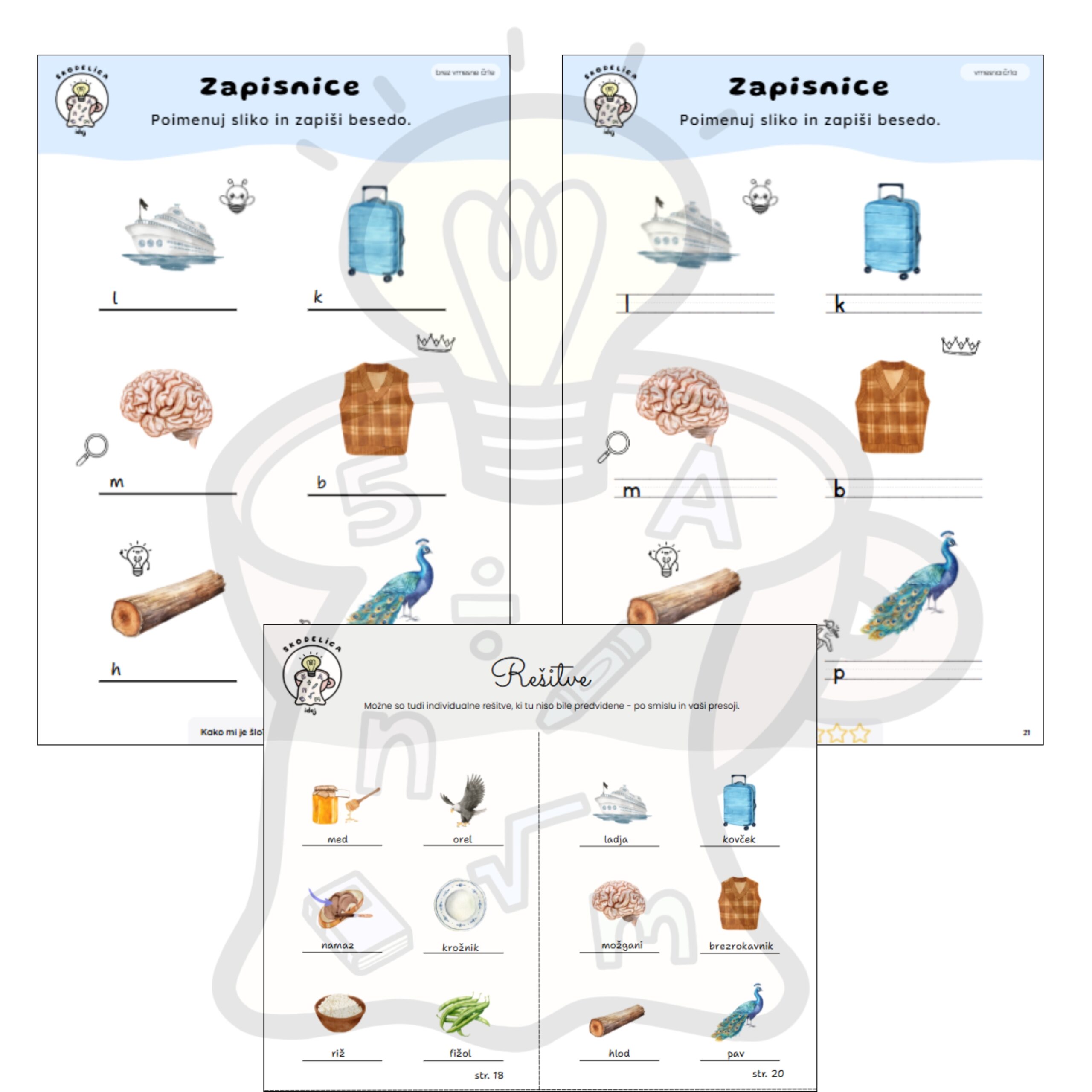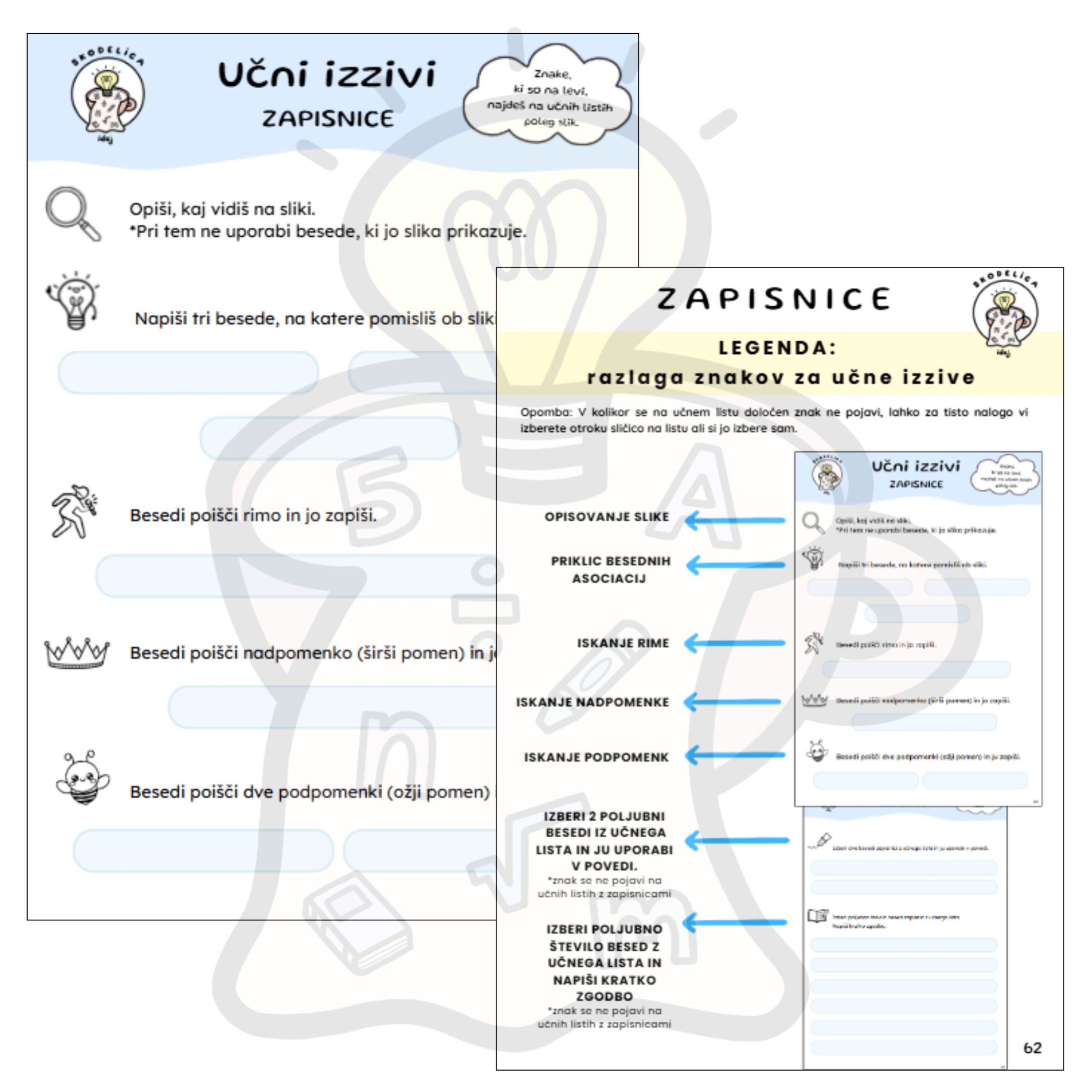Učni listi Zapisnice so namenjeni usvajanju oz. utrjevanju pravilnega zapisa besed, priklicu besed in širjenju besednega zaklada. Vsak učni list vsebuje šest slik. Pod vsako sliko je zapisana prva črka besede.
